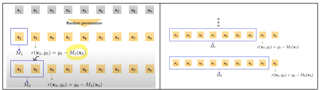 첫 번째 객체만을 이용해 트리를 만들고, 두 번째 객체에 대한 잔차 계산시에는 첫 번째 모형의 결과물과 두 번째 객체의 y값을 가지고 계산함.